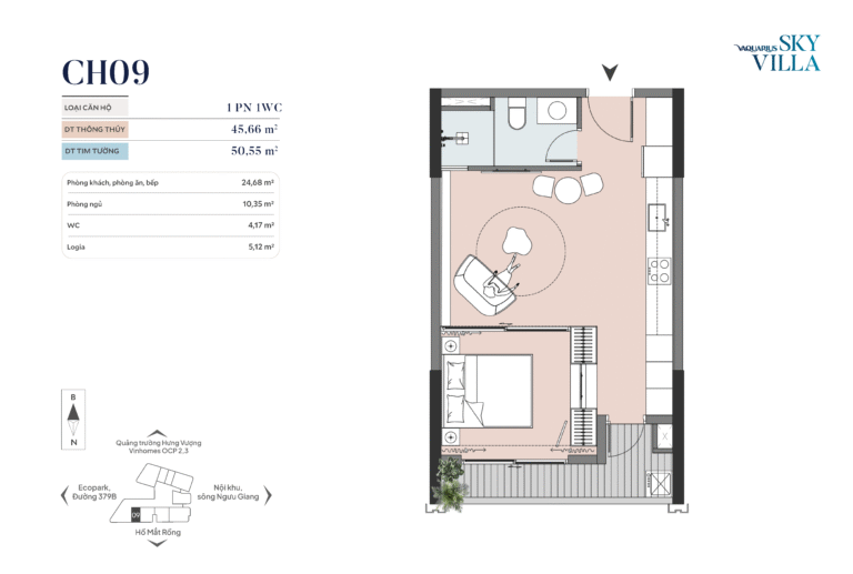 | Tiếp giáp | ● Phía Đông: giáp vườn hoa nội khu và khu thấp tầng Vaquarius ● Phía Tây: giáp đường ĐT.379B ● Phía Nam: giáp hồ Mắt Rồng và cụm tiện ích ven hồ ● Phía Bắc: giáp trục đường chính dự án Vaquarius, phân khu A và quảng trường Hưng Vượng |